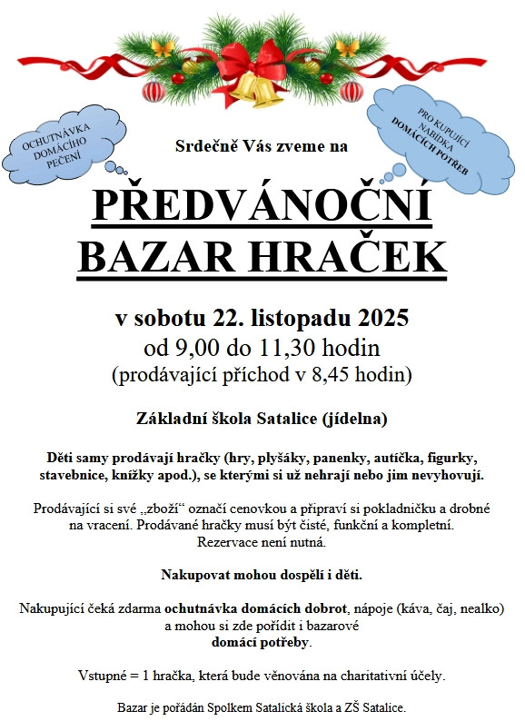 V sobotu 22. listopadu 2025 proběhne v prostorách školní jídelny Základní školy Satalice tradiční Dětský bazárek hraček. Akce se uskuteční od 9:00 do 11:30, prodávající děti se mohou dostavit již v 8:45.